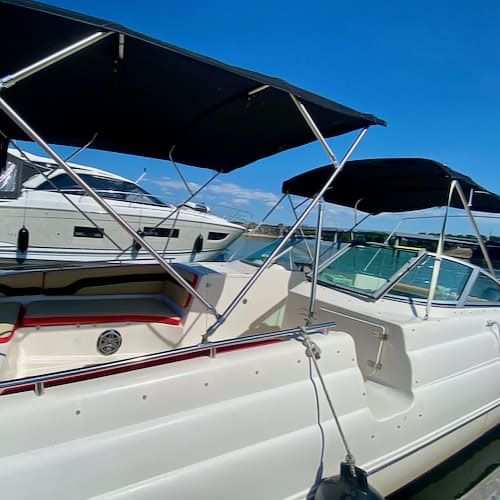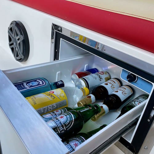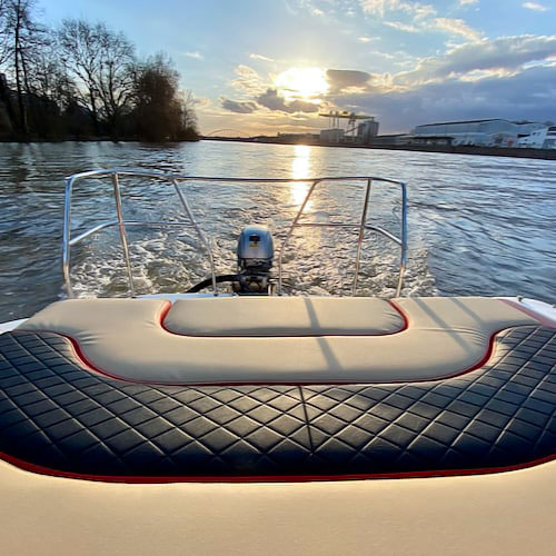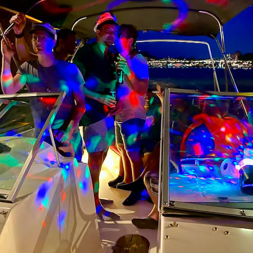 Unser Partyboot [Deluxe] ist der Inbegriff von JGA-Spaß: 10 Meter Länge, Cabrio-Verdeck für Sonne & Schatten, eine großzügige Sonnenliege (3,5 qm) zum Entspannen, die Tanzfläche mit 12 qm für ausgelassene Moves, dazu HiFi-Anlage mit Bluetooth, Disco-Lichter, Kühlschrank, Cupholder und sogar ein WC!